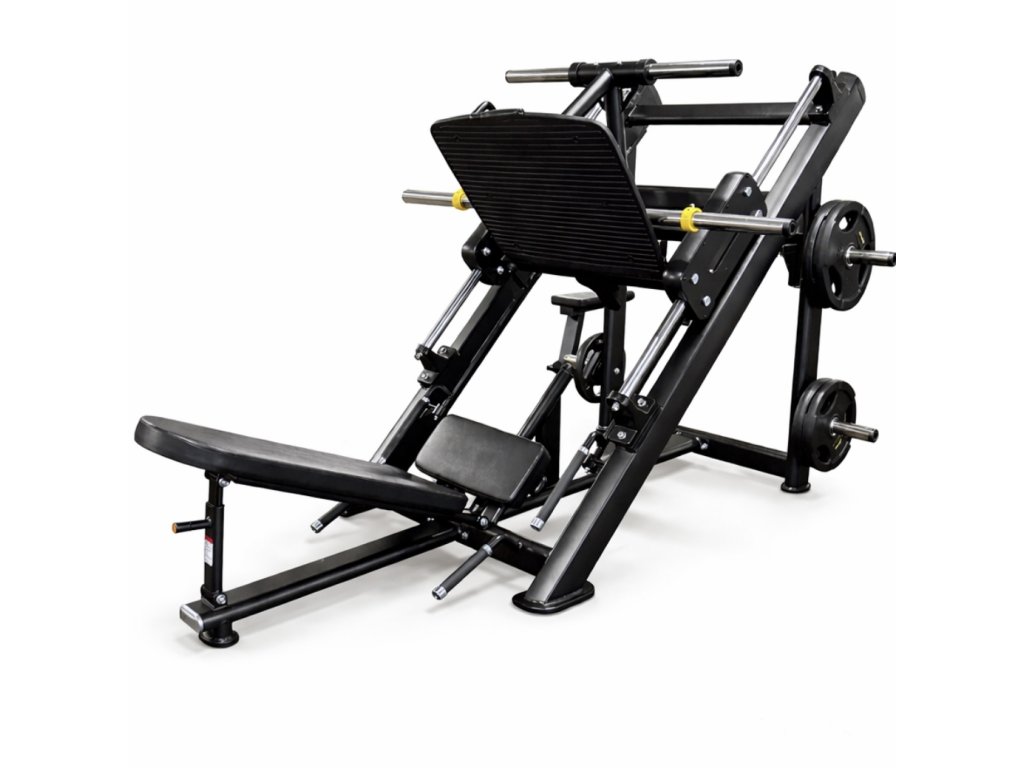 Leg Press je stroj pre profesionálny tréning nôh v ľahu. Využíva voľné závažia, konkrétne olympijské kotúče, pomocou ktorých je možné regulovať záťaž. Nakladacie tŕne sú vyrobené z odolného polyamidu, ktorý neponesie známky poškriabania ani pri častej výmene závažia.