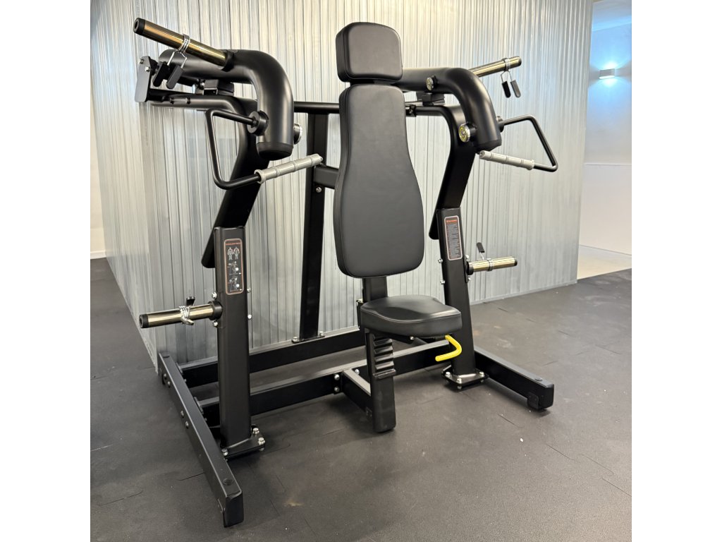 Posilňovací stroj na voľnú váhu ramená Shoulder Press. Vyrobený z pevných pravouhlých profilov. Ramená stroja sú vyrobené z kruhových profilov. Stabilná konštrukcia zaisťuje bezpečnosť a efektivitu tréningu. Stroj má prídavné držiaky nákladu a nastaviteľné sedadlo. Každé rameno funguje samostatne.